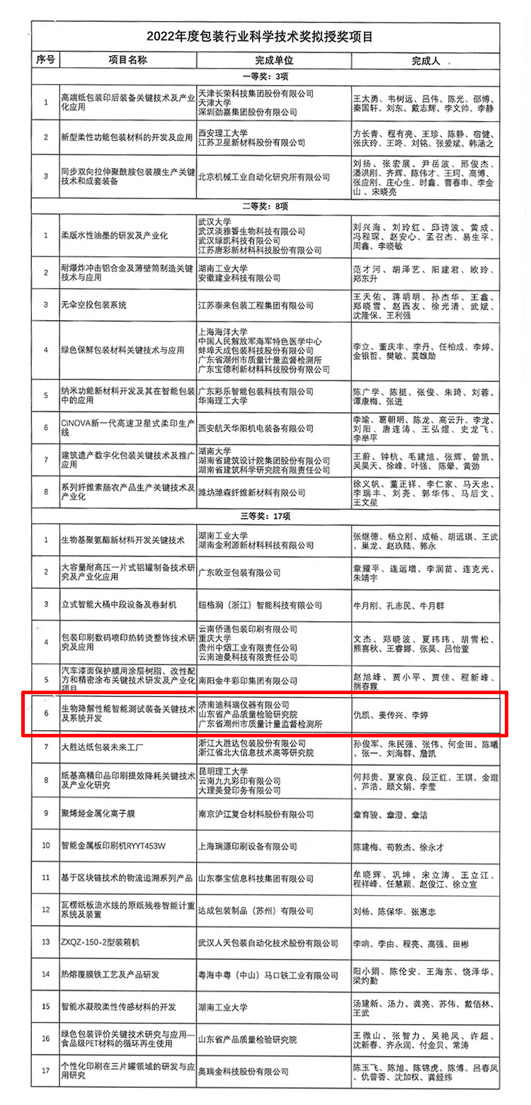 近日2022年度包裝行業(yè)科學(xué)技術(shù)獎勵管理委員會工作會議在線上召開,本年度共收到包裝行業(yè)科技獎申報(bào)項(xiàng)目77項(xiàng),經(jīng)形式審查提交專家評審項(xiàng)目53項(xiàng)。經(jīng)專家評審,最終建議授獎項(xiàng)目28項(xiàng)。由濟(jì)南迪科瑞儀器有限公司作為主要完成單位申報(bào)的《生物降解性能智能測試裝備關(guān)鍵技術(shù)及系統(tǒng)開發(fā)》項(xiàng)目,獲得2022年度“包裝行業(yè)科學(xué)技術(shù)獎”三等獎。